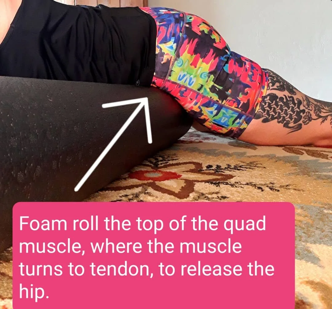 If you have a foam roller, use my pics here to find your quad tendon. Foam roll up and down 10 or more times for about two inches right below the hip bone. Then, rock side to side about ten times on that tendon, with the leg relaxed. You should foam roll both legs. If you have back pain, you’ll probably find that one quad tendon is tighter than the other. In the first pic at the top of this article, I’m using a foam roller to release the front of my hip, or for those of you who know anatomy, the top of my quadriceps group where muscle turns to tendon.